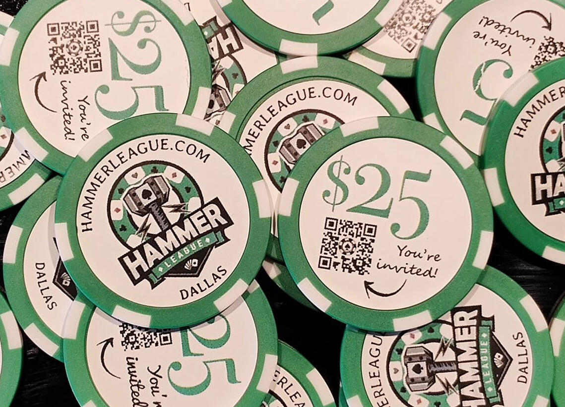 Were you given one of these chips? You were personally invited to the private Hammer League live games!At our friendly home games, we spread $1/$3 no limit hold'em at all times. We usually have a PLO game going too.That green chip is worth a real $25 on your first visit. And the person that invited you also gets $25!Hammer League also hosts the annual Sledgehammer Poker Championship, a multi-day $40,000 GTD event. The next event is scheduled for Q1 2025. We hold weekly online satellites and live freerolls throughout the year.When you're ready to come play, reach out to your host or contact us through one of the many options below!