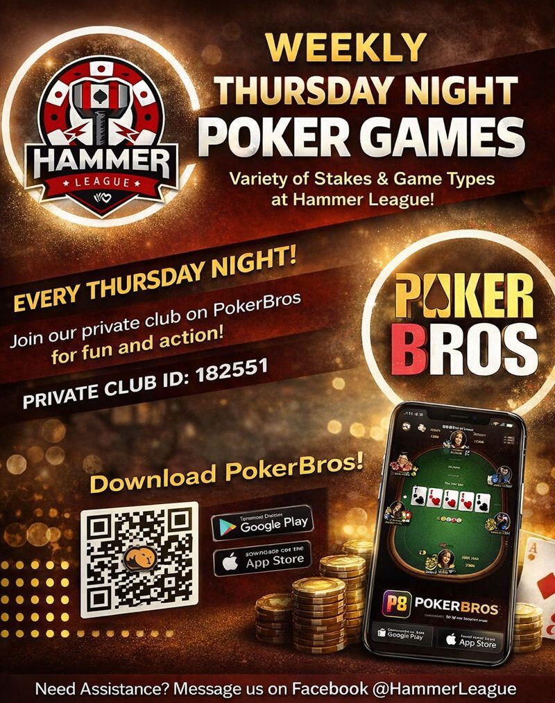 We are nearing the end of Season 8 (2026) and getting ready for the annual Hammer League Sledge Hammer Poker Championship (SHPC)!Our $50,000 GTD tournament spans over 2 weekends starting Sat Feb 21st. It's a $250 entry, rebuy tournament with three Day 1's that allow for flexible scheduling for you.You do not have to be an existing member to join the fun!If you need more information on joining the tournament, reach out to us at one of the links at the bottom of the page!------------Entry lammers can be used for re-entries, multiple Day 1's, and for add-ons.
