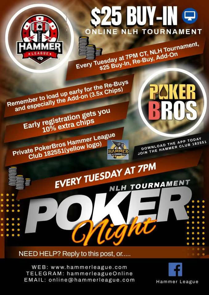 ♠️♥️ HAMMER LEAGUE ONLINE ♦️♣️PokerBros UNION Hammer League PB club 176948, Agent 93246PokerBros PRIVATE Hammer League PB club 182551---------------------If you haven't played in our online games and FREE ROLLS--here's how:0. Download https://www.pokerbros.net to your phone or tablet1. Create your PRIVATE account name and password2. Choose a PUBLIC nickname different from PRIVATE login account name3. Use the magnifying glass to join the Main Club ID 176948 (Referrer 93246) for access to larger tourneys, the BBJ, and 24x7 cash games. This is "Contingency Fun"4. Use the magnifying glass to join the EXT Club ID 182551 (leave Referrer blank) for private Hammer League games. This logo will be a yellow hammer.LAST: Reach out to us 24/7 for info on loading your account with chips to play with!-- Telegram https://t.me/hammerleague-- send an email to [email protected]-- Message via Meetup-- Join the Hammer League FaceBook (DFW locals only)Sincerely, the Hammer League Team!